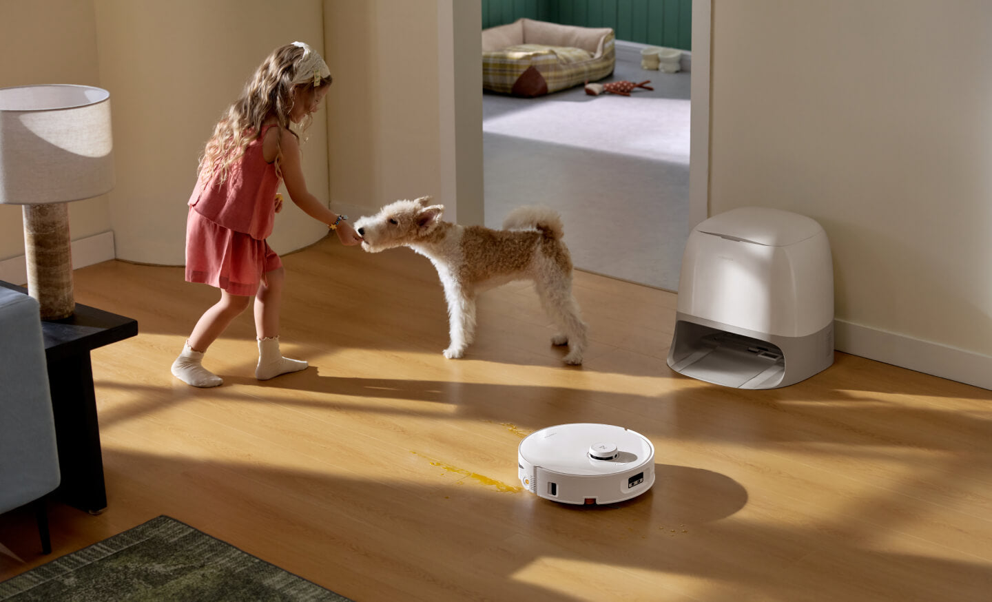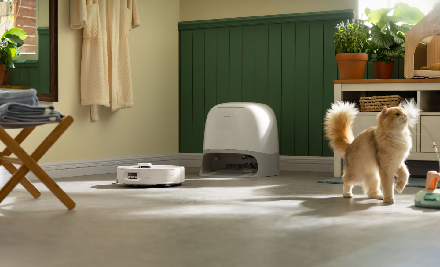 När roboten närmar sig kattungar eller valpar stannar den omedelbart sin huvudborste och flyttar sig åt sidan för att undvika att skrämma dina husdjur.