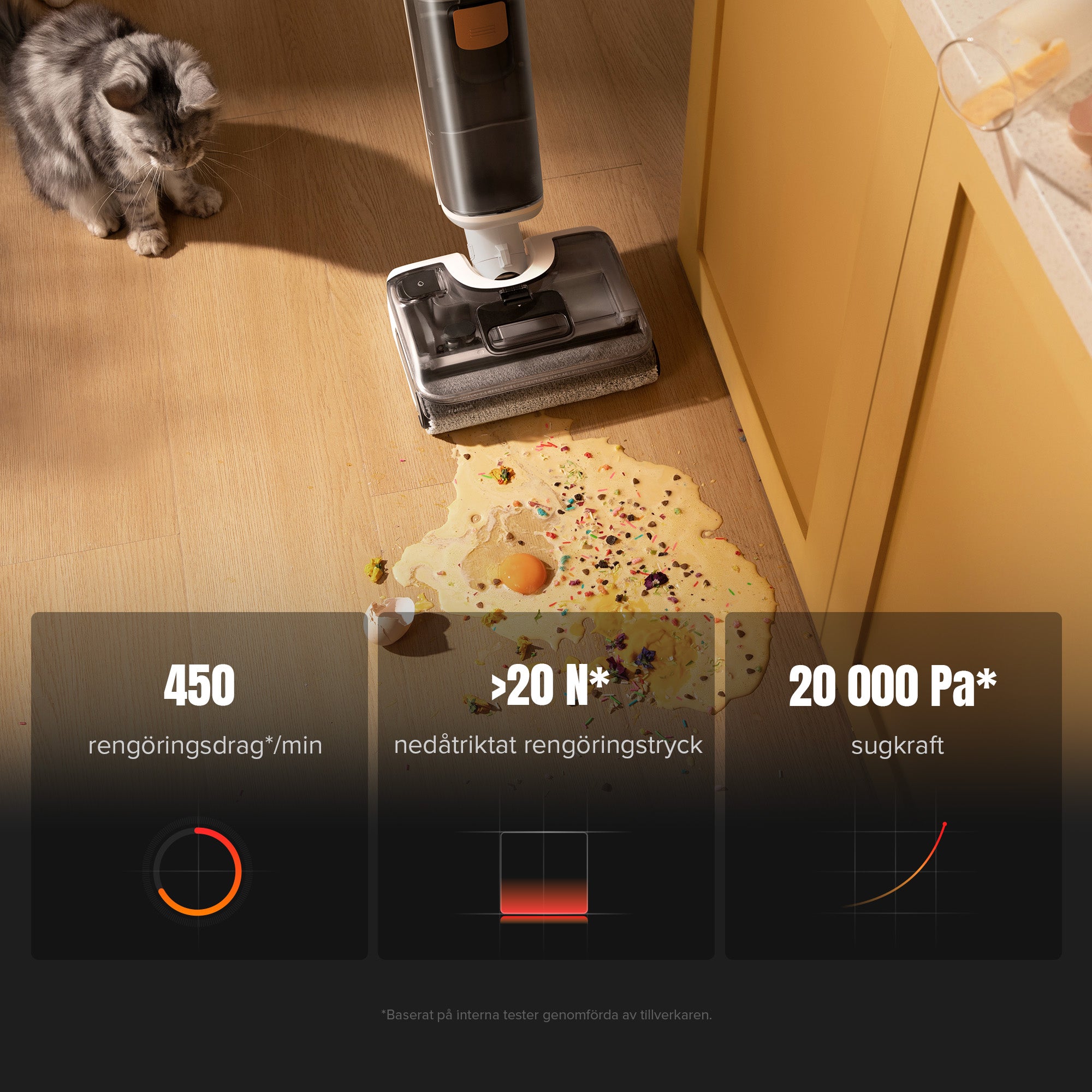 A: 1. Sugkraft: 20 000 Pa – Kraftigt sug för grundlig rengöring av olika ytor.