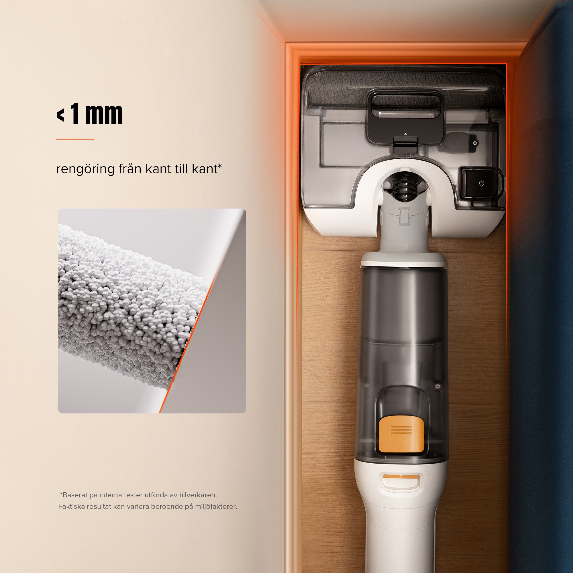Förbättrad med en låg vattenbehållare och 70° vridbar design kan den enkelt glida runt möbler och hinder, vilket ger en jämnare och effektivare rengöring.